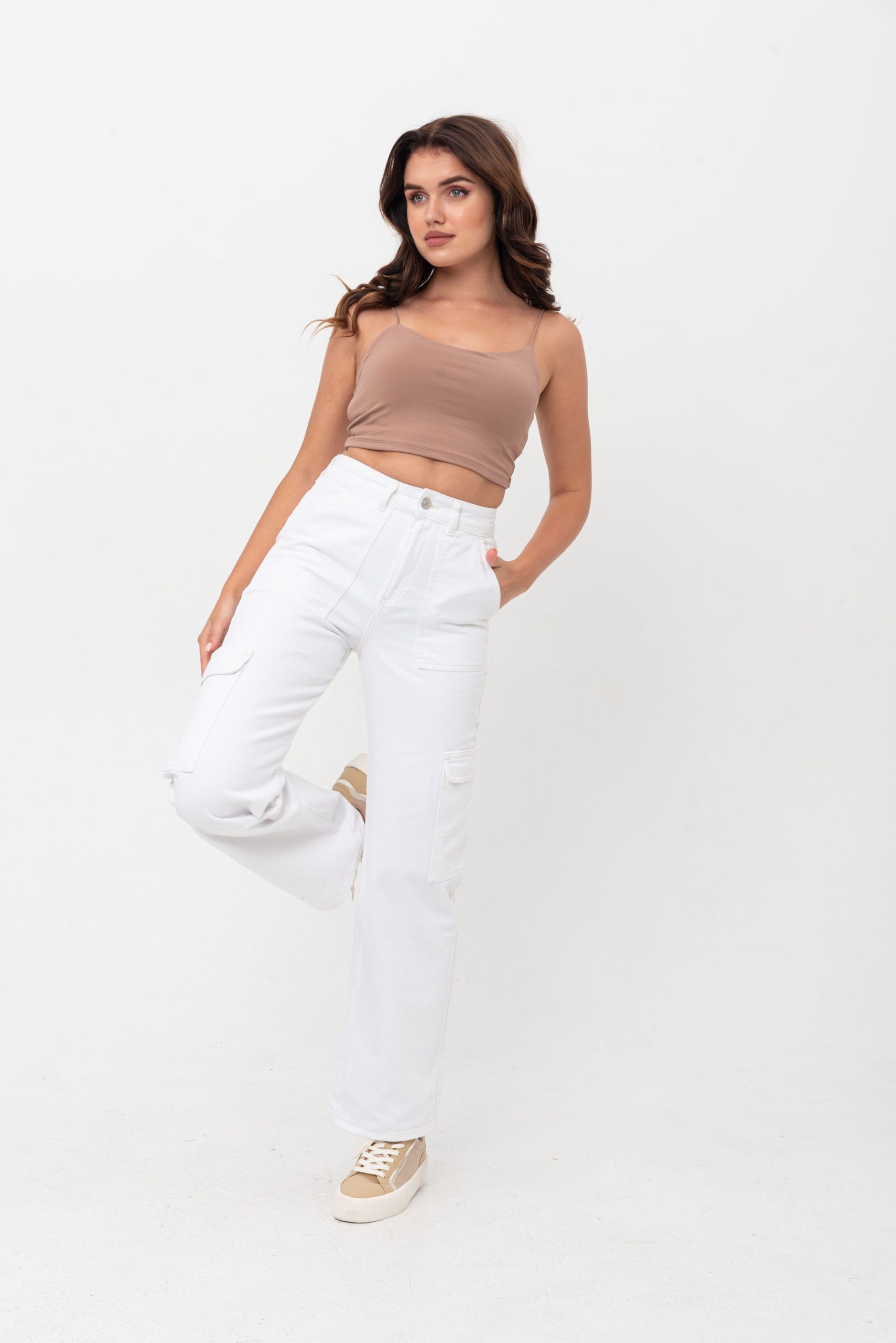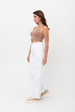 Kadın Beyaz Süper Yüksek Bel Kontrast Kargo Straight Fit Jean Pantolon