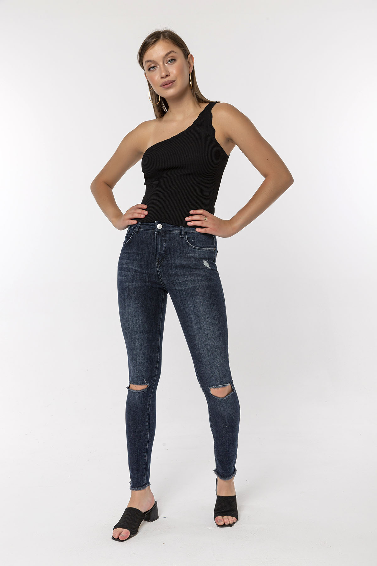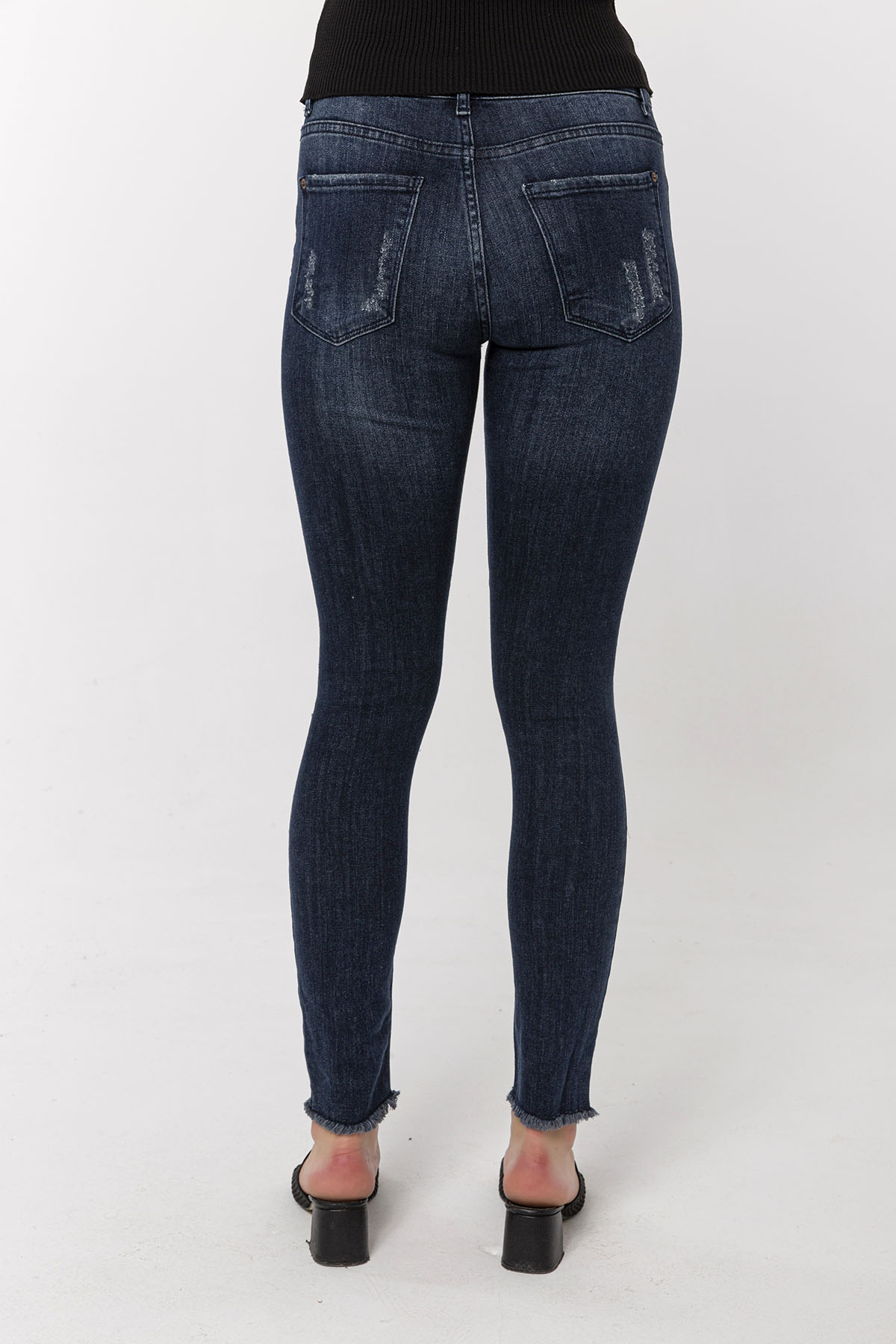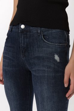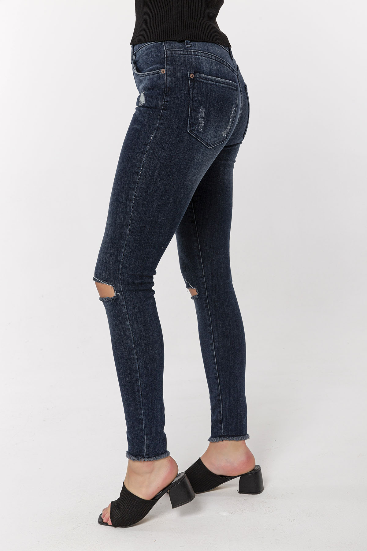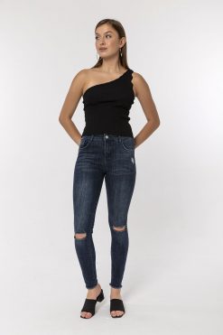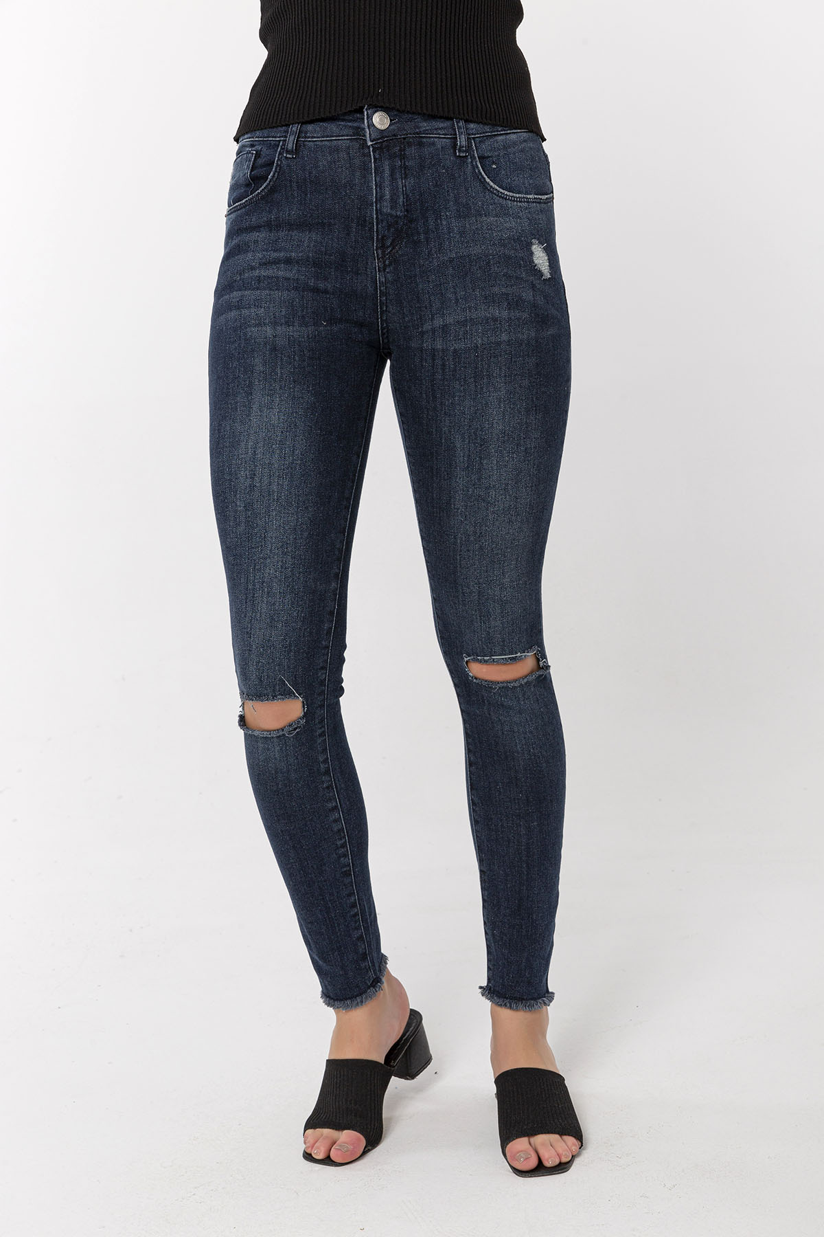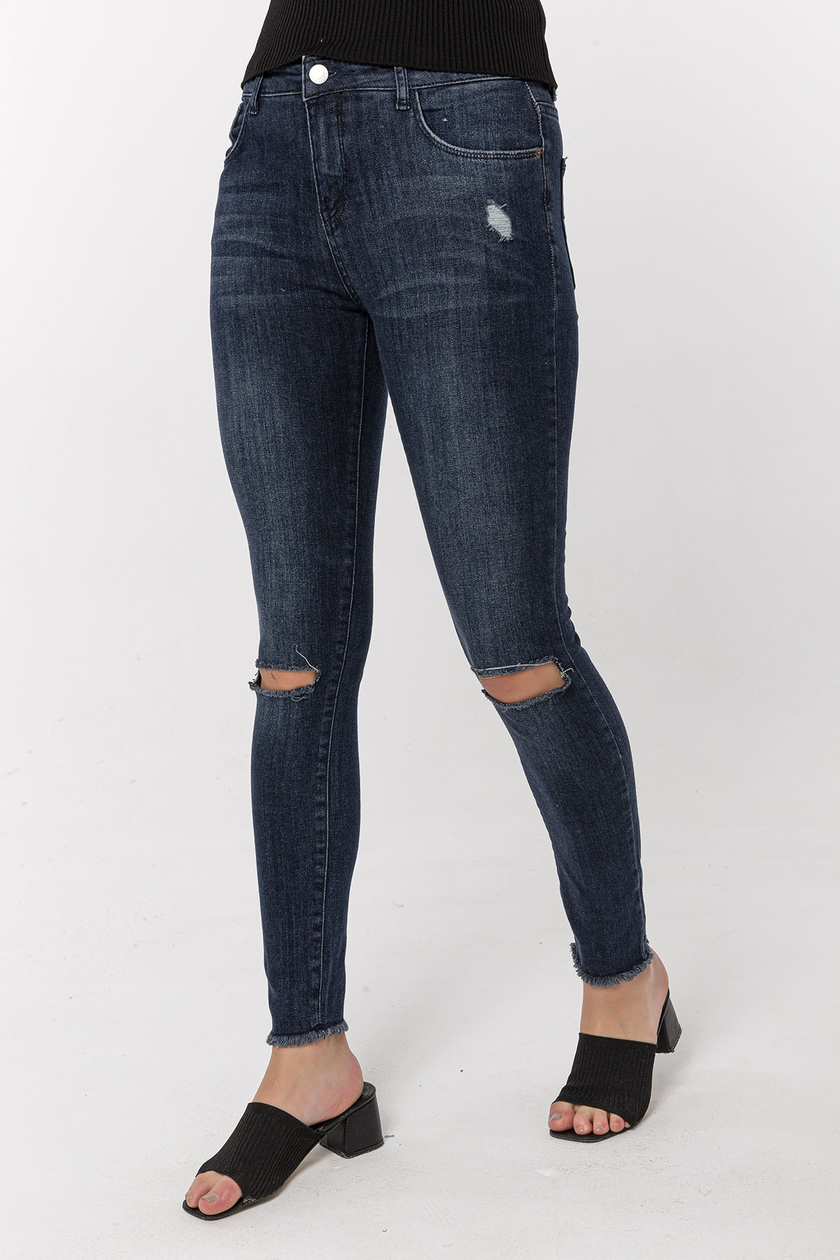 Koyu Mavi Dizi Kesikli Skinny Jean