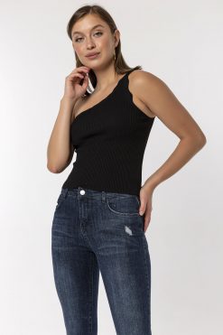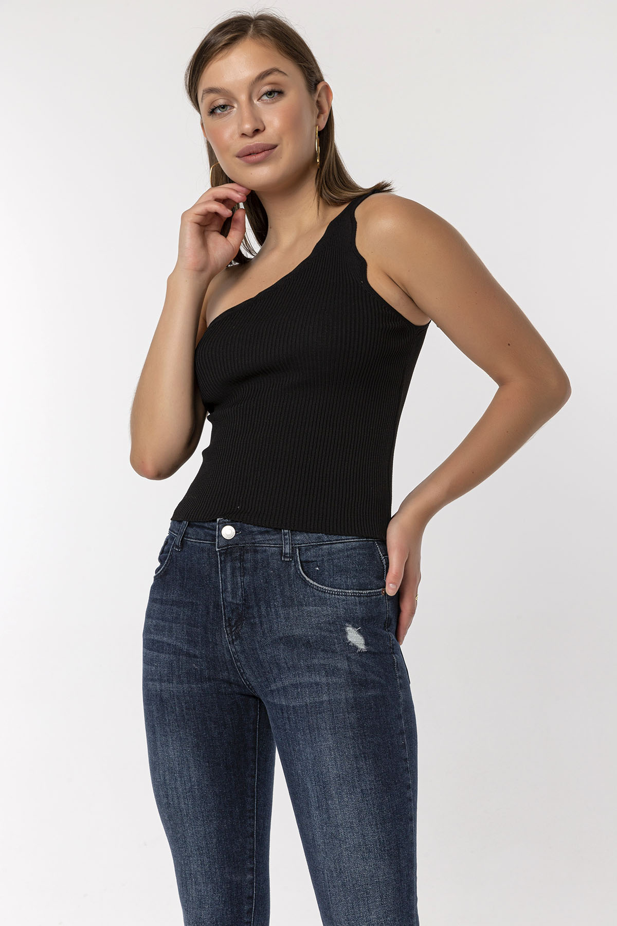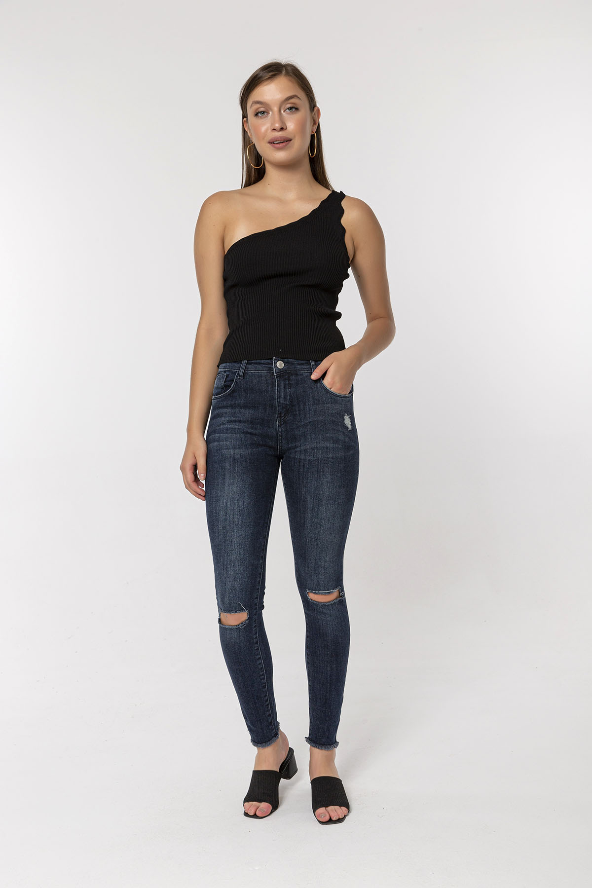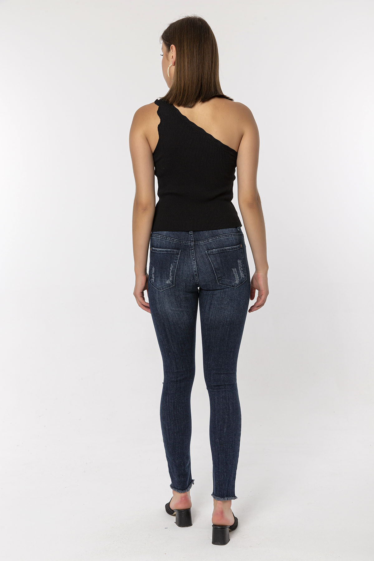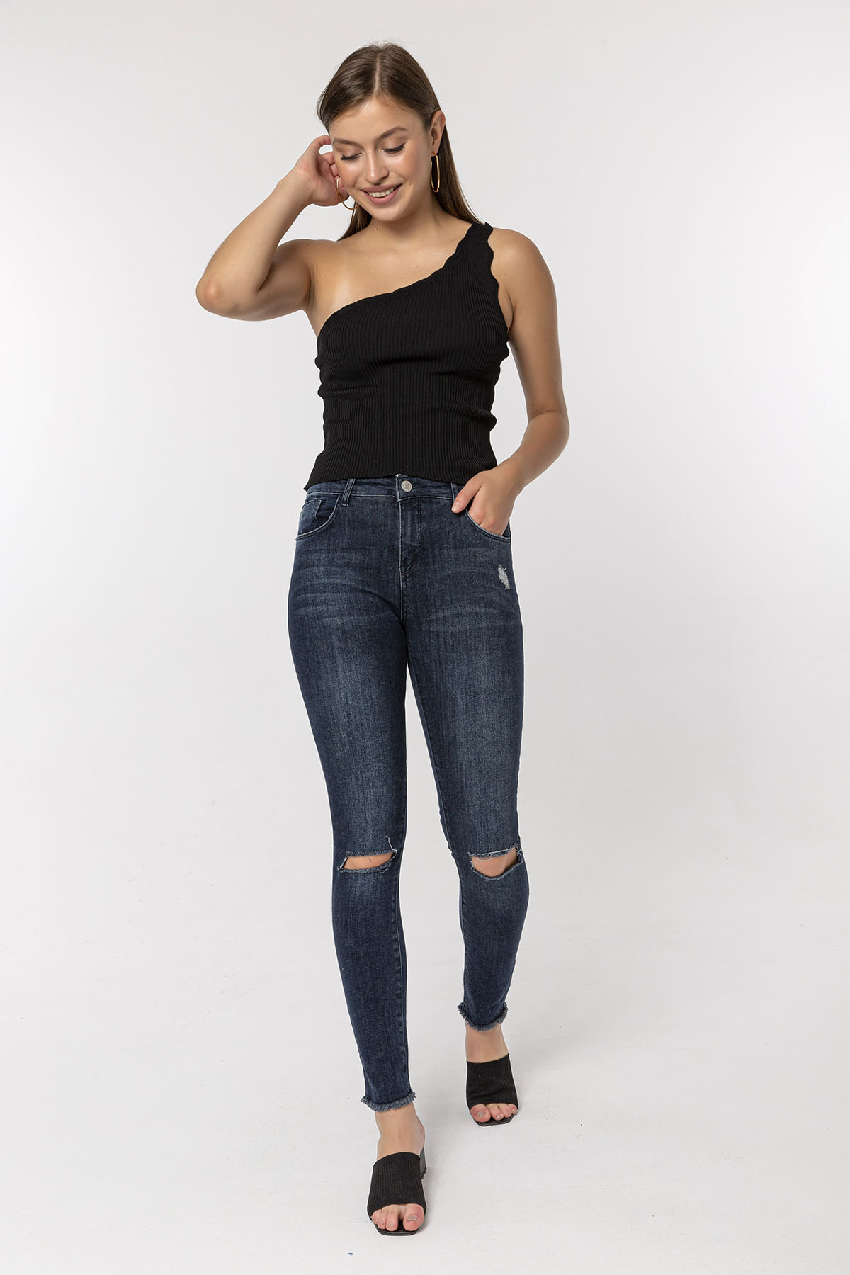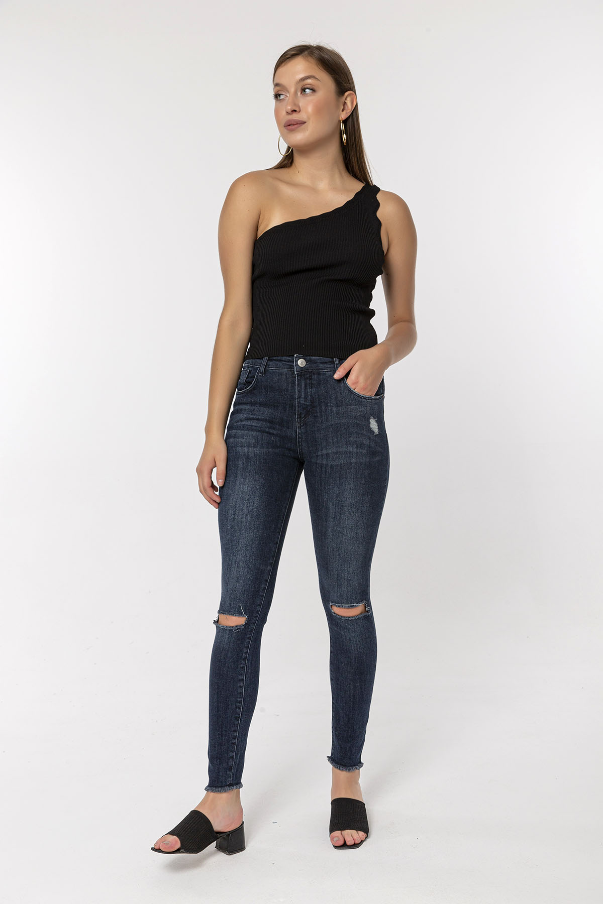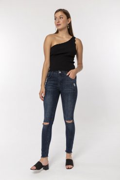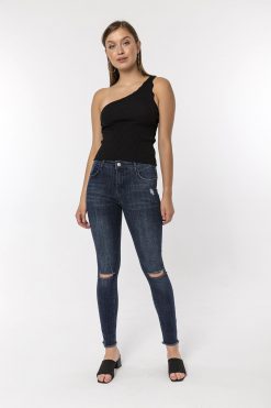 Koyu Mavi Dizi Kesikli Skinny Jean