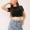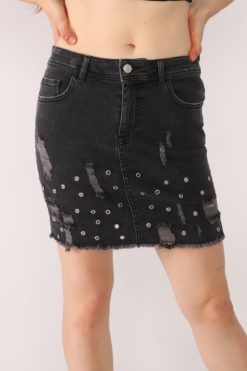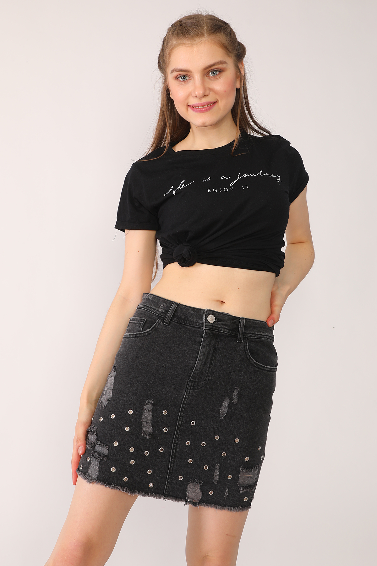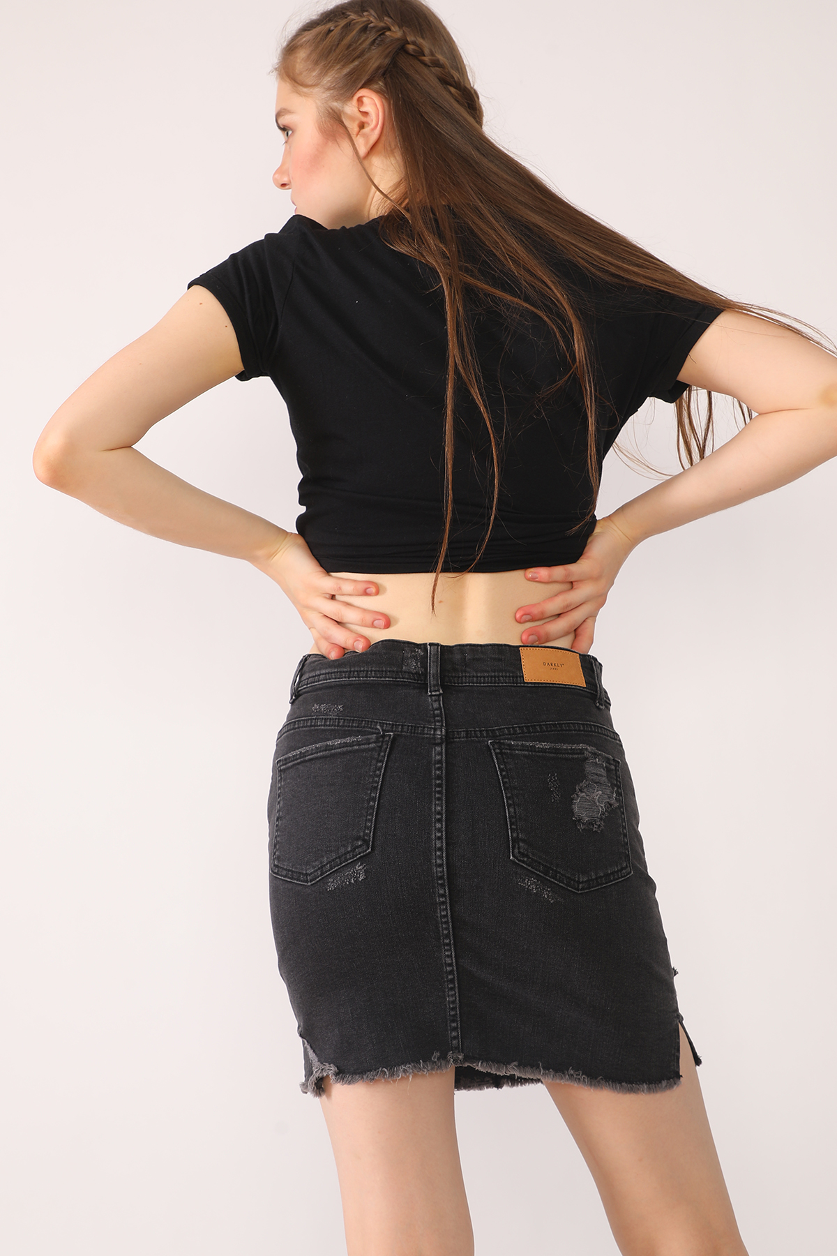 Kuş Gözü Detaylli Yırtmaçlı Siyah Kot Etek