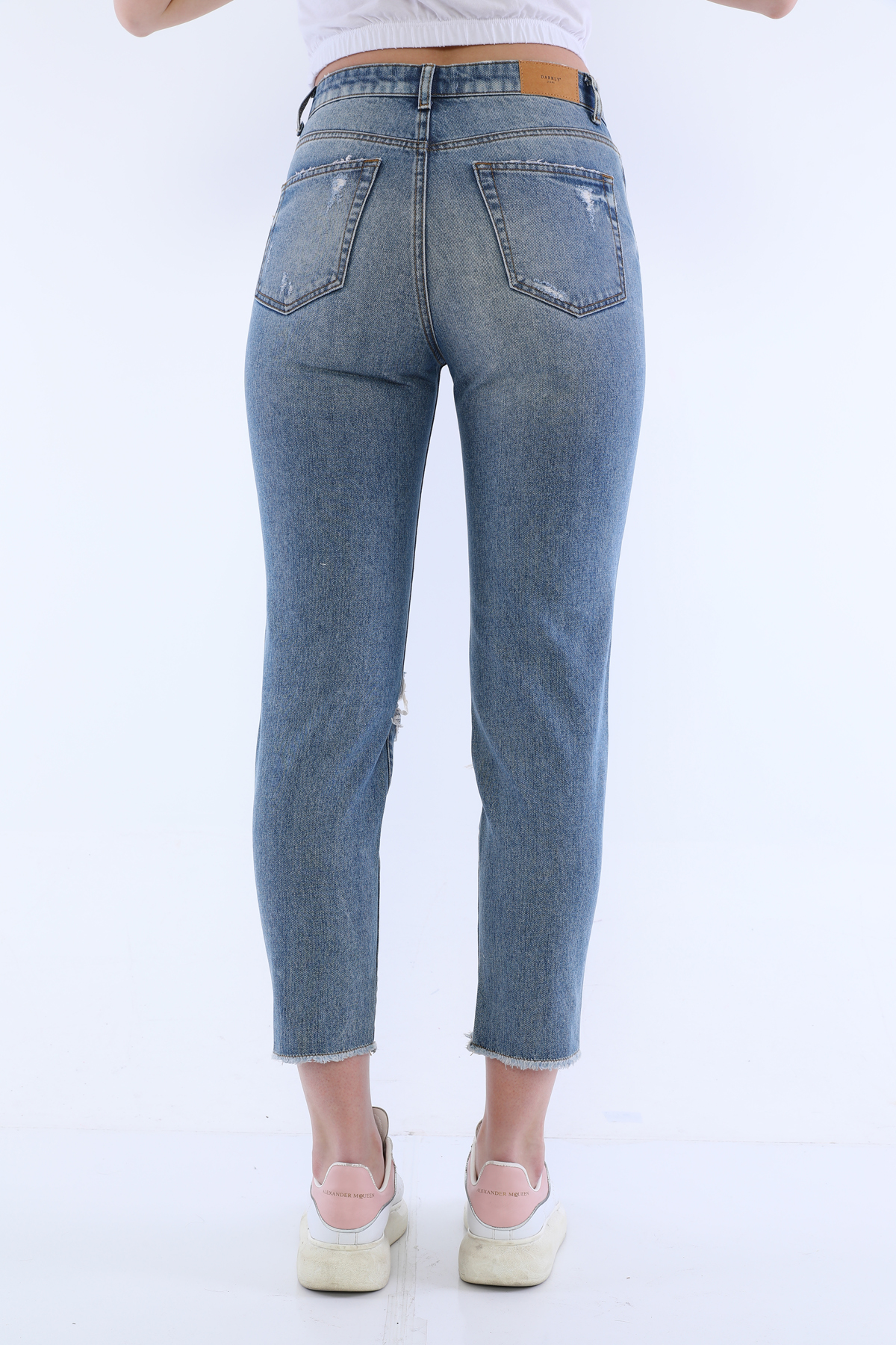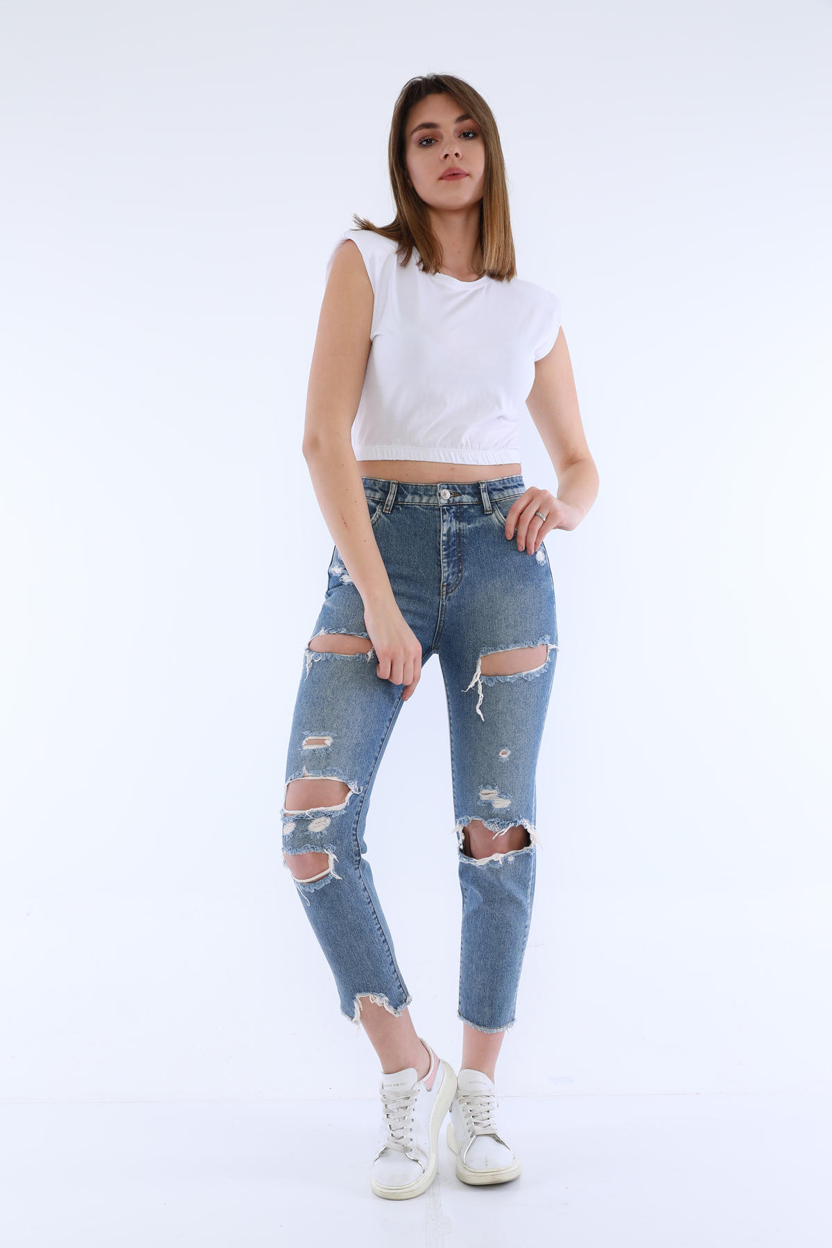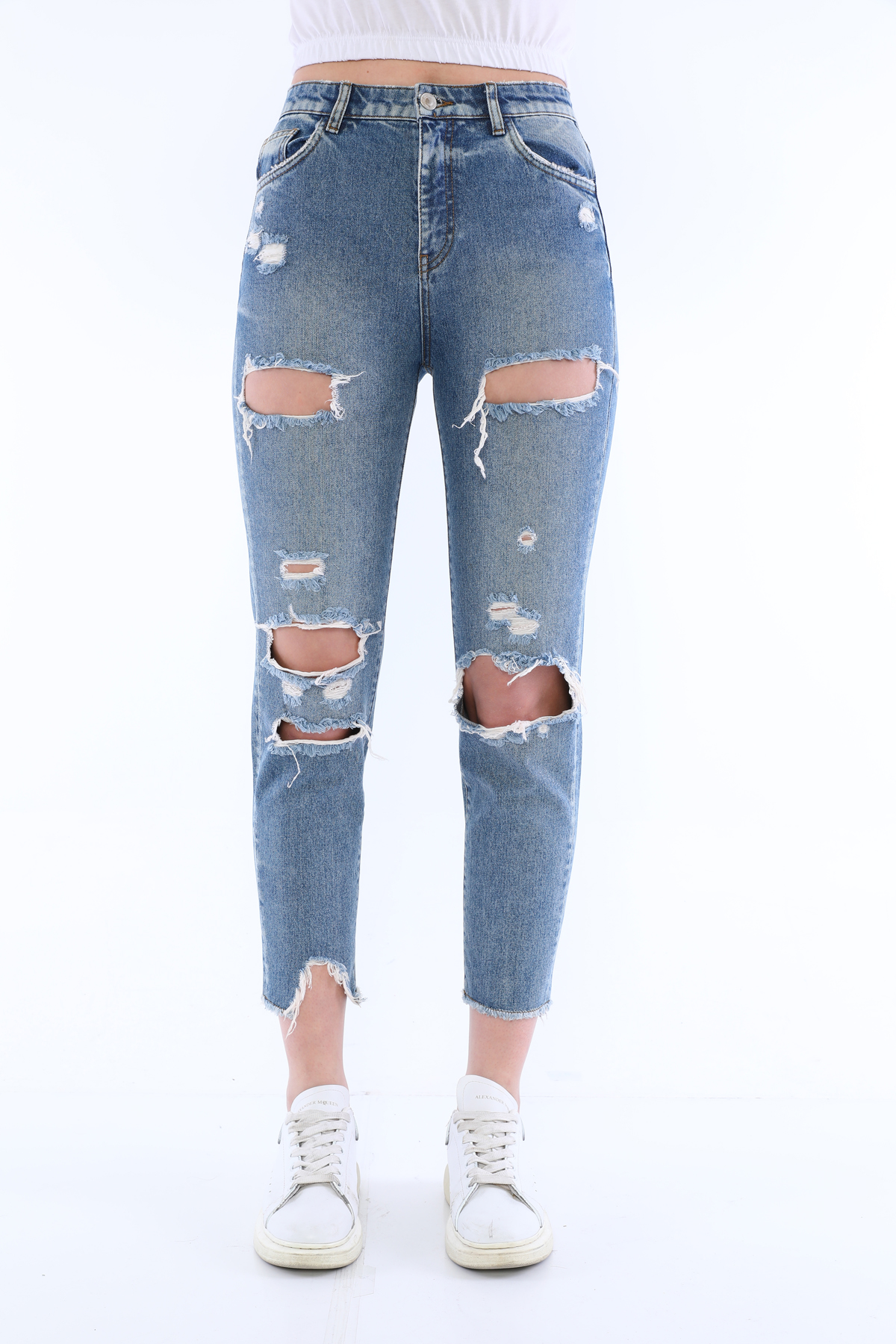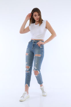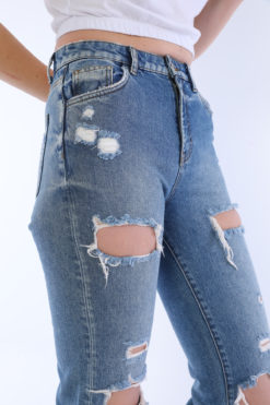 Mavi Yüksek Bel Yırtıklı Jean