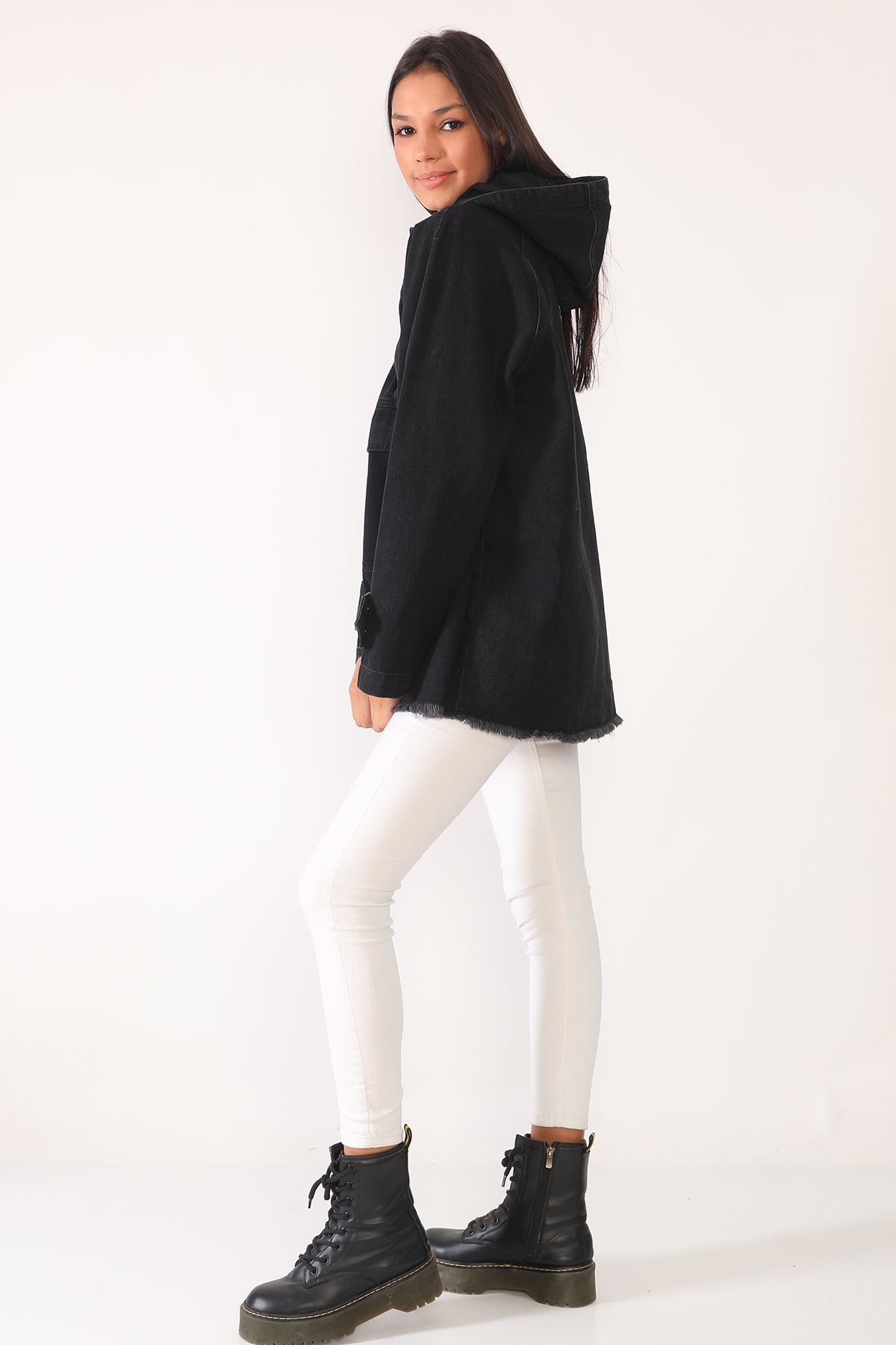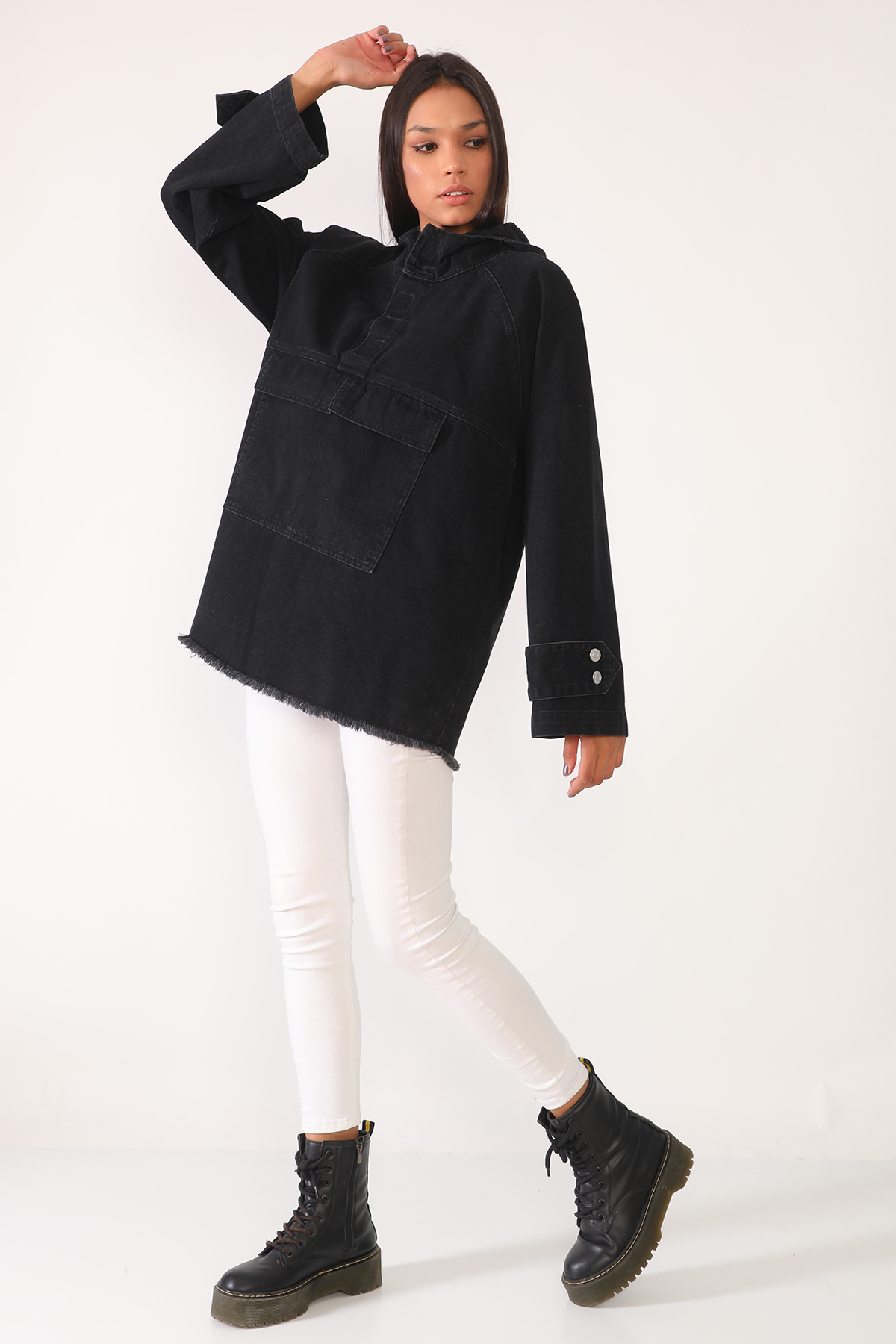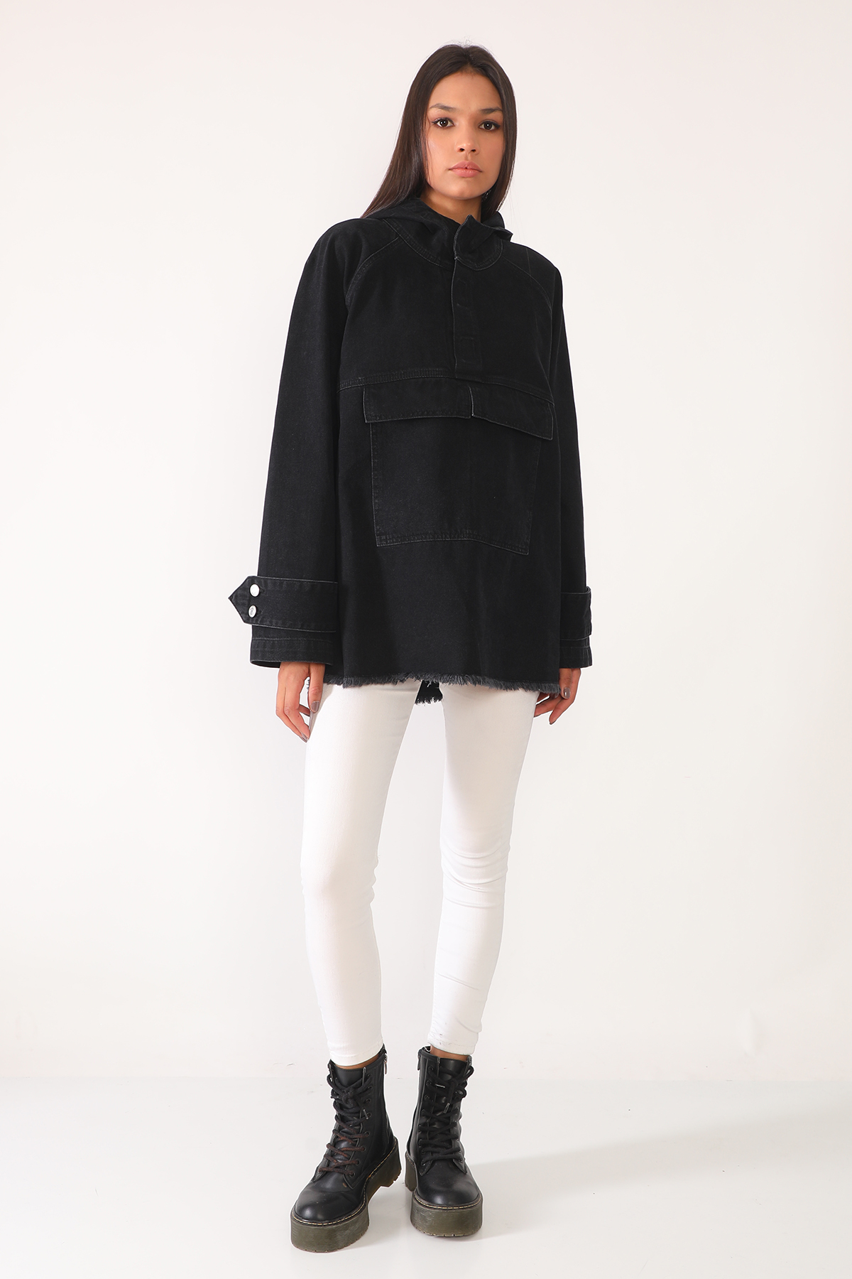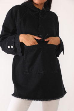 Siyah Kanguru Cepli Kapişonlu Jean Ceket