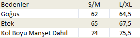 | Bedenler | S/M | L/XL |