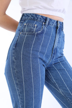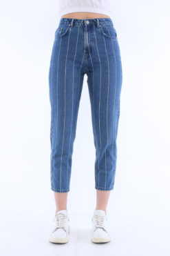 Yüksek Bel İnce Çizgili Mavi Mom Jean